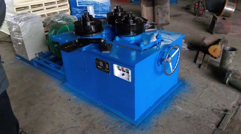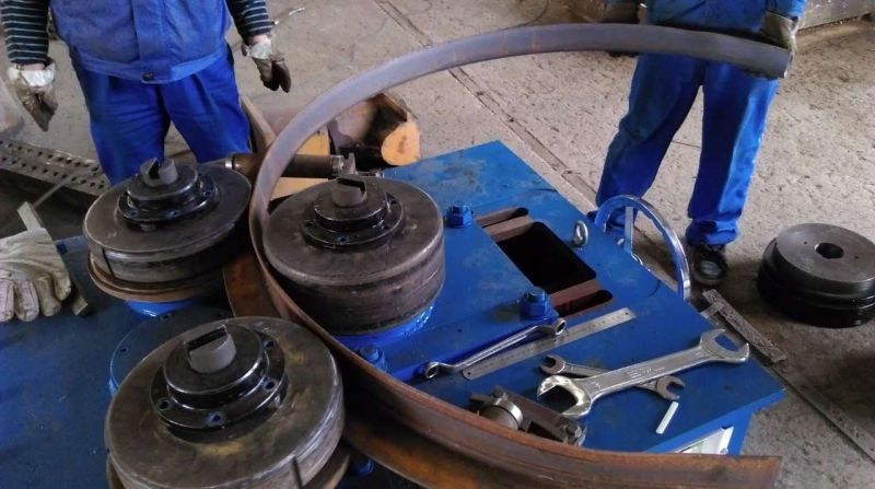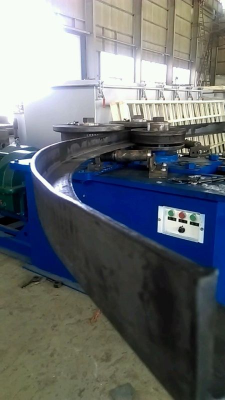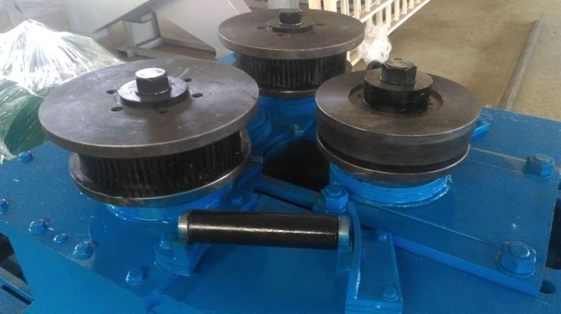 F6型卷圓機是對稱式三輥型材卷圓機,集機電一體,將電動機輸出的較高轉速通過傳動裝置、聯軸器、減速機、齒輪等轉換為所需的大轉矩低轉速,帶動位置固定的兩主動輥實現旋轉運動,為型材行走提供扭矩。被動輥通過手輪前進、后退實現位移,為卷制型材提供所需的加壓力,位移量由數字標尺實時顯示。三個工作輥成等腰三角形分布,通過移動被動輥位置實現這三個點形成的弧線達到所需彎曲半徑,即調整所彎型材的曲率。借助被動輥的壓緊及兩主動輥的旋轉運動,使型材經過多道次連續彎曲,產生永久性的塑性變形,用于常溫狀態下將型材卷制成圓形、弧形、螺旋形等工件。